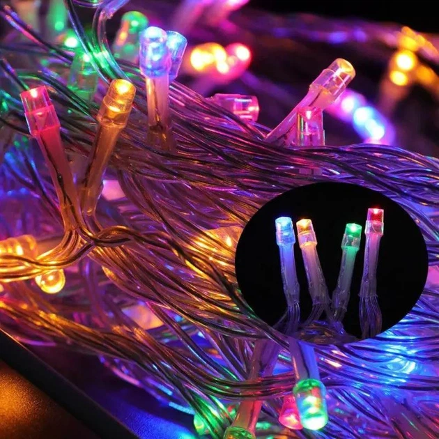Різнобарвна LED гірлянда від мережі, прозора, 10 м, 200 ламп / Електрична гірлянда прозора / Лід гірлянда на ялинку